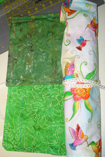 A view of the inside as well. Roll was made entirely of fabrics from my pre-existing quilting stash–just glad they could be used finally and not sit in that tote any longer! I’ve had a hard time trying to use my L.B. prints, nothing ever seems special enough for them. Until now, that is. Considering I didn’t have to buy any outside materials to make this, I feel it’s very nicely color-coordinated and looks like I intentionally picked fabrics out!