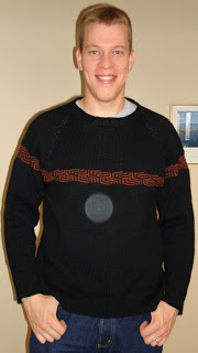 I finally finished the Manly Maze. There it is, magic orb and all. It turned out really well and I’m very pleased with it overall. The only thing I’d change is to add some more length to the sleeves. Lesson learned: check how they fit when arms are moved as well. May have helped if DH was a bit more accomadating during the try-on sessions as well.