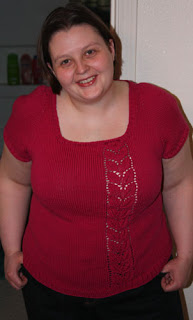 Mods have been listed in previous posts about this sweater, but to give the Cambell’s version I a) knit flat and cast on only 1 stitch per front panel until I got to a depth of 5.5″ down, b) backwards loop cast-on the missing front panel stitches and went in the round from there, c) added an extra 2″ to the front panel by casting on stitches when I took the arms off of the needles, and d) added a 3.5″ deep horizontal bust dart.