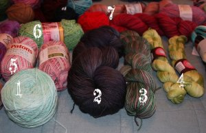 4. MadelineTosh sock in William Morris (3 skeins), see Irish Lass. Pretty, highly variagated, will have to give it some serious thought. Will have to alternate skeins.