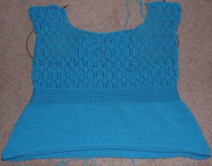 I’m a bit further along then this now, just finished the increases for the gusset, but I wanted to work on other projects as well. Right now, I have more on needles then is usual for me. For some reason, it just feels right for July and I’m picking and choosing what I want to work on based on the day. I’m slowly making progress on my Sea Shell top. I’ve divided out for the front and back and am a couple of inches above the bottom of the armhole on the front piece. It won’t be too much longer and I’ll be shaping the neckline and finishing up. I haven’t wanted to work on the lace too much with as distracted as I’ve been, and stripes on socks are a bit more fun. Especially in Robin’s Egg Blue and a Berry Red.