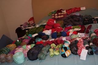 There is the second half of the bed. I attempted to make groupings of yarn to make them easier to document. (Not pictured is a small amount of dish cotton–seriously, dish cotton is not stash–and a few random skeins of acrylic I have lying around that I use as waste yarn. Oh, and two sweaters I have yet to frog and reclaim the yarn from…) Doing this also made it easier to repack my totes in a way that made more sense. Yay for organization.