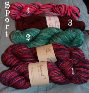 3. Sundara FSM in Irish Lass (2 skeins), not sure about this one. Maybe a Featherweight Cardigan? Maybe a tank top of some sort? Too pretty to let go of–one of my LE scores–yet almost too pretty to use and need to find the right project to showcase it.