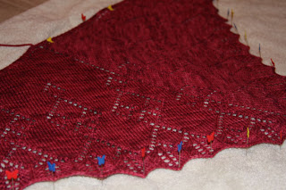 And Hayworth is finally blocking. I should have an FO post for it in a day or two. Not much else going on here, so that’s it for now. (Yes, I’m using my bed as a blocking board. Wish I had thought of that sooner. I’ll have to reblock all my shawlettes that way.)