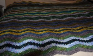 » There had been a question asked about the pattern to this blanket if there is one. And the answer is yes, I did have a plan going in. I’ve been alternating between sets of [gray, green, blue, teal, blue, green] and [gray, blue, green, teal, green, blue] the entire time.