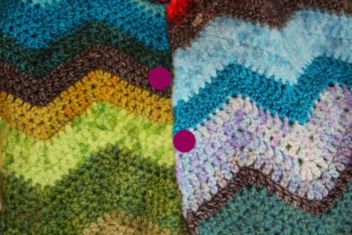 If you don’t, you end up with a partially felted blanket/project. (Felted portions have raspberry dots next to them to point them out.)