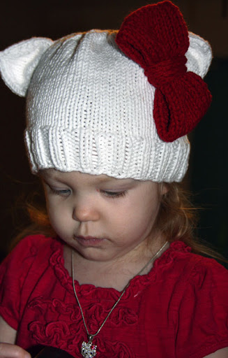 Next, we have The Girl’s Hello Kitty hat which was part of her Halloween costume this year. Again, this was improvised with a little guidance taken from another pattern to figure out how to knit the ears in the round and get the shaping correct. I did the same with the bow: peeked at a pattern, saw how it was done and then just did my own thing.