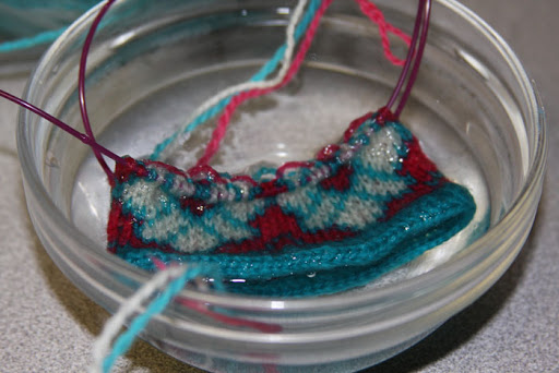 Now, you kittens may be asking yourselves, “Why is that knitting in a bowl of water?” Good question. I was checking to see if upon blocking, a) the stitches would even out and b) I could block the cuff just a bit larger. Because you see, kittens, my gauge is spot-on for the smallest size, which I need for my actual wrist and most of my hand measurements, but the width of my hand is in between the small and medium. Trying to test out the mitten yesterday, it was a struggle to get it over my thumb. After the thumb, it fit beautifully. My floats are not tight and I’m purposefully not keeping my tension as I usually do. But, it was an issue.