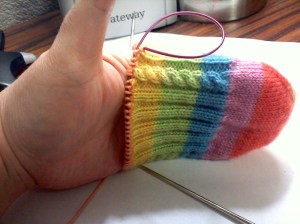 I’m currently working on a toe-up “pattern” for all of my self-stripers. Plain stockinette can be dull at times, even with the thrill of the next coming stripe, so I threw in a cable on each side to add to the interesting knitting factor. I didn’t need to make these anklets, but I had been convinced they were not going to be wide enough to climb up my leg, so I lopped them off early. Turns out, I could have easily knit another 1.5-2″ of leg.