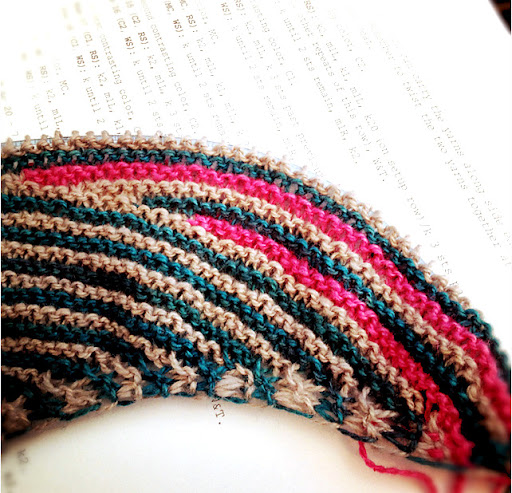 My first choice is the insanely popular Color Affection shawl by Veera Välimäki in the colorway shown above–seriously, you would have to be living under a rock and avoiding all contact with the online community to not be at least familiar with this pattern. The yarn is a gorgeous and painfully soft cashmere/silk blend in a lovely dark teal, bright magenta, and lovely driftwood color. It’s listed in the Ravelry data base as a lace weight, the label doesn’t given any information either way about it, but I feel it’s light fingering-ish. It’s definitely not heavier weight, but few of my projects are if I have to be totally honest. I rarely venture above sport weight for anything.