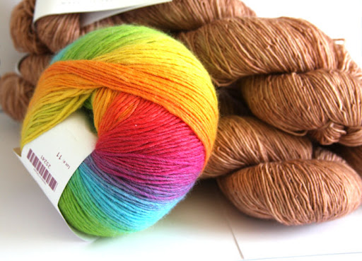Another choice is a stripey sweater–still not sure of neck shaping or sleeve style–in this lovely palette. The colored yarn is less red as it appears here, and more very deep raspberry pink. It was difficult to get a good photo of. And the lightest color is less blaring white than it appears. These are all merino/silk blends and in the fingering weight range. I have so many self-designed stripey sweaters planned for the future that it isn’t even funny.