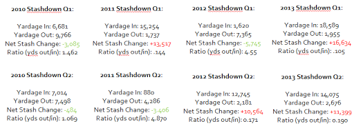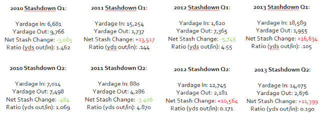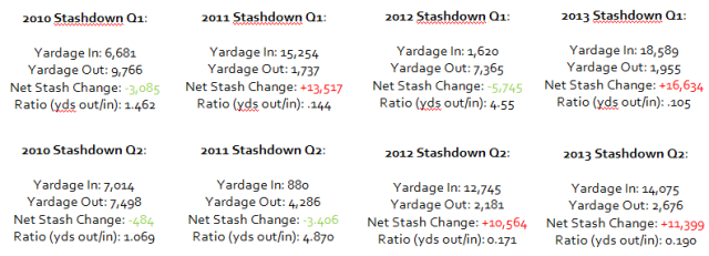 So here it is: Quarter 2 of 2013’s Stashdown efforts.  This year I am tracking all four year’s worth of numbers and seeing if any trends pop up.  So far…I’m not getting much out of them.  But I find this fun in a weird, nerdy sort of way.