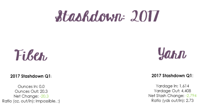 Well! This is a very positive way to start off the crafting year, if I may say so myself. If I can keep up this momentum the remaining quarters, I should have a healthy-though modest-stash reduction all around! Let’s look at those numbers.