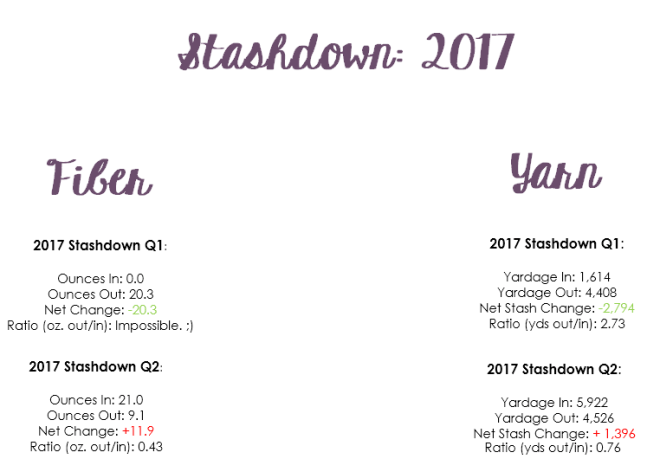 Yarn Stash first. If you follow my Yardage Tally posts, you know a whole lot of knitting happened in Q2, but not a lot of those projects were finished, so they could not count as stash out. Thanks to gifting several skeins of sock yarn to my mother and her efforts to become a regular sock knitter, I did have a fairly high yardage output. It wasn’t enough to combat all of the solid colored yarn I purchased from KnitPicks to go in my sock yarn blanket, however. Those little skeins of fingering weight yarn add up fast. Add some handspun into that equation and I had a pretty high yardage in number. (It’s about 3 times higher than in Q1 when my yardage in was almost entirely handspun, for example.) If I can keep up a steady pace on the blanket, I should be able to negate that number in at a later date towards the end of the year–blow it out of the water, really, as each square seems to be in the upper 400s/nearing 500 for yardage–but it can be frustrating in the present to see that red mark against me. I am still in the green for the year overall, but I will need some pretty big numbers out in Q3 and Q4 if I want to see much change in my yarn stash.