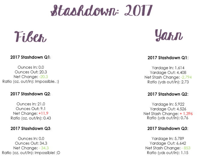 I had not realized I bought zero ounces of fiber for a second quarter in 2017! It’s amazing how much my purchasing attitude has changed since last year. I seem to have finally reached a place where if I’m not spinning much, there’s no reason to be stashing. Most of that number out was spun during Tour de Fleece, but about 1/3 of it was destashed to a spinning friend who was running low on fiber… and I have so much excess. It felt nice to rehome it. I’m rather hoping Q4 can be another Impossible! quarter, and that I will end the year with quite a bit less fiber stash than I had at the beginning. (On a fun side note, this is the first time since Q4 2015 that I’ve had under 500 oz of fiber in my stash. That feels pretty shameful to admit, as 500 oz is 31.25 pounds. I still have a large 2-3 year old child’s worth of fiber waiting to be spun up. It’s ~ 125 braids of fiber, y’all. Eeeesh. It took a long time to start getting that number heading back in the right direction, but I’m hoping it’s a trend that continues.)