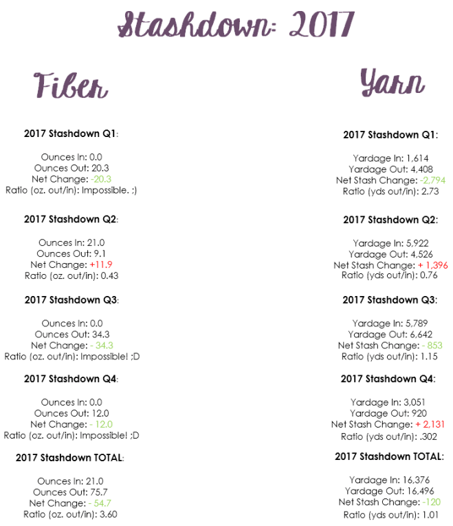 I am pretty pleased with those numbers! Even though my stash reductions were not quite as amazing as I had hoped…they are still heading in the desired direction. I will take a stash maintenance in the yarn category and a 3.4lb loss in the fiber category any day rather than more increases. So I call that a successful year of more mindful stashing! And I *could* have had some actual stash reduction, but anyone who has followed my monthly yardage tallies knows that I had a serious knitting slump from June through November of this year. Knitting next-to-nothing does not make for great amounts of yarn usage: who could have guessed? So this “small” victory feels much bigger because of that fact.
