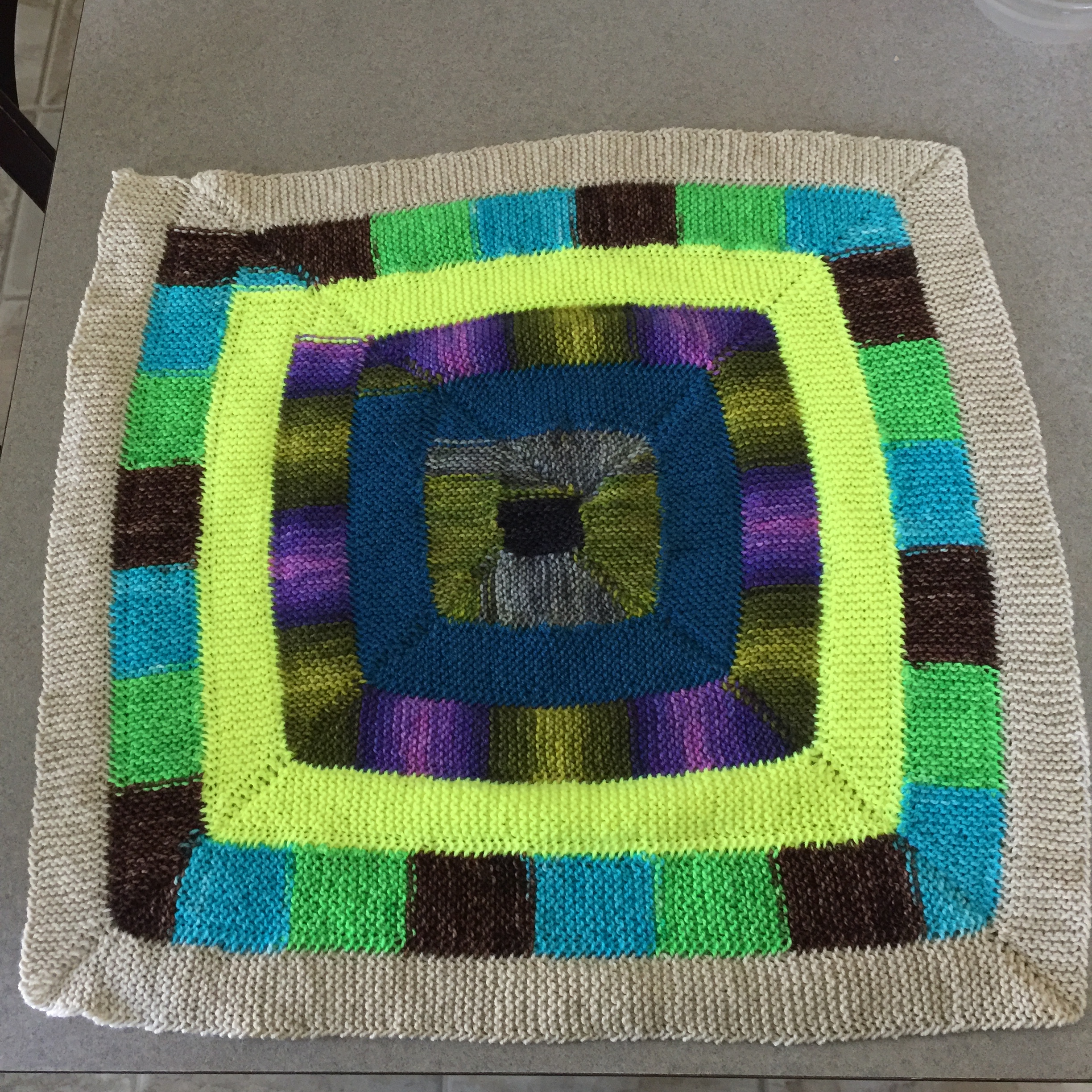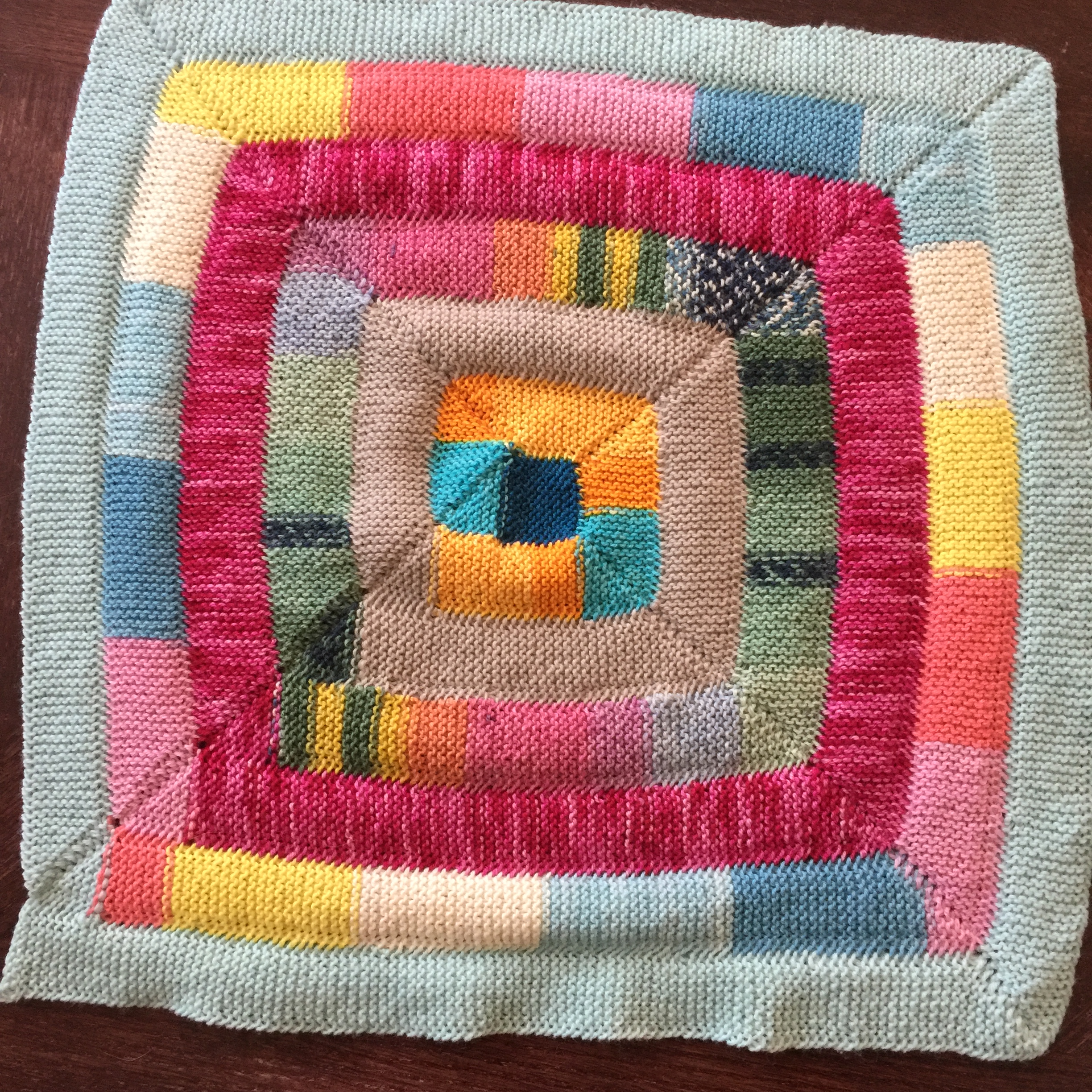 It turns out my yardage was a bit harder-earned in May, but I still had a pretty impressive number given that almost all of my knitting was fingering weight yarn held single this time around! I also knit maybe 1/4 as much this last month; I was more interested in reading and messing around on some of my game apps on my phone. Like many other places in the US, our weather decided to jump from February straight into mid-July, and the summer heat sucks my knitting mojo right out of me. (My lowest yardage months tend to be June through September, when I focus mainly on knitting socks or maybe a single shawl while I work on other things like cross-stitch, sewing, or spinning.) Given we’re only 5 months into 2018 and I’m already to 80.3% of my 12,000 yard goal for the year, this is perfectly fine. During the month I managed to work on another blanket square, knit one pair of shortie socks plus start another pair, and I knit about 1/3 of a fingering weight Boxy sweater (flat to seam, so I’m purling all the stitches in this project). It was a good month for knits!